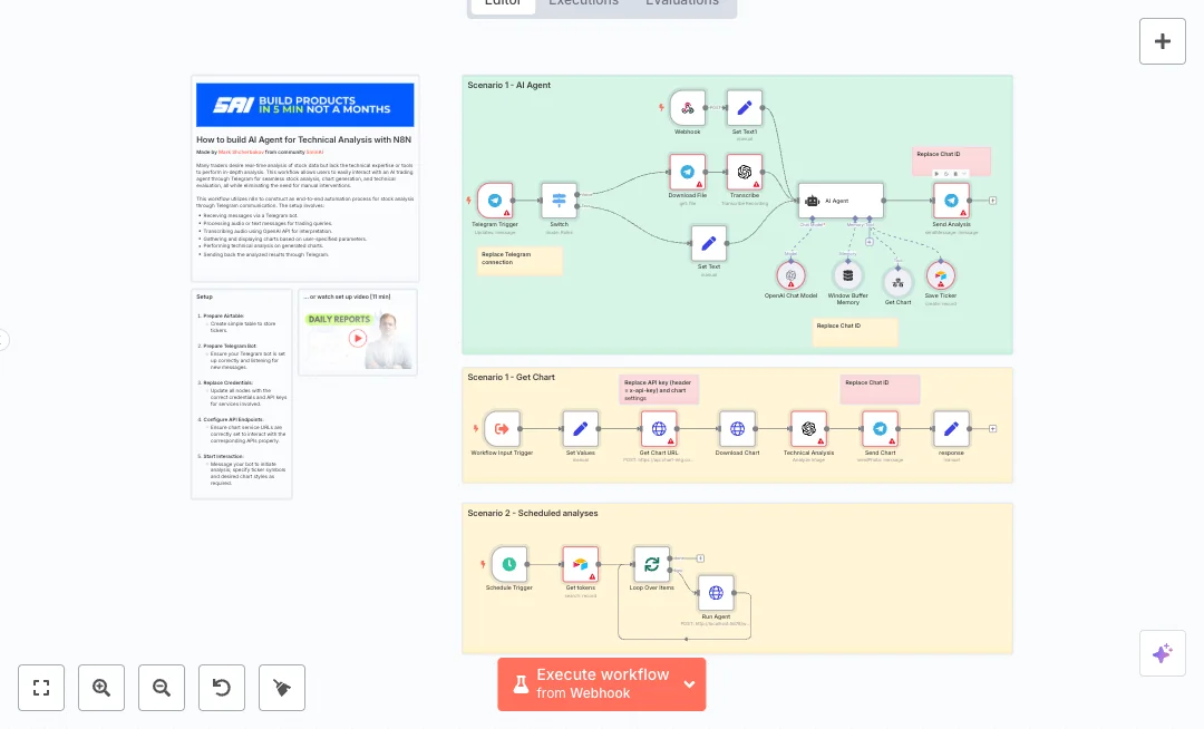 Incoming messages from Telegram trigger a flow that handles text and voice. Voice notes are downloaded and transcribed with OpenAI, then passed to an AI agent with short term memory for context. The agent can call a chart tool that builds a TradingView style image through the Chart IMG API, and then sends both the chart and the written analysis back to Telegram. A schedule trigger reads tickers from Airtable, loops through them, and posts regular updates without manual work. A webhook path lets other apps submit tickers too.
