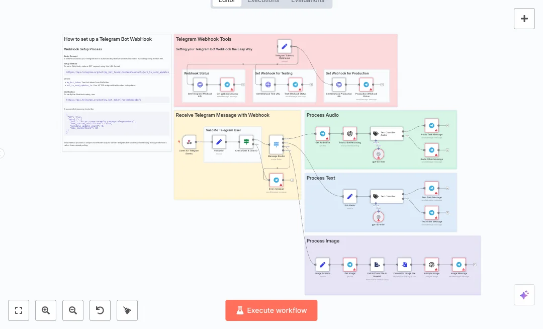 An HTTPS webhook receives updates from Telegram. A gate checks user and chat IDs to allow only approved traffic. A router sends audio, text, or photos down the right path. Voice notes are downloaded and transcribed with OpenAI, then classified to decide if they are tasks. Text is scored by a separate OpenAI prompt to split into task or other. Photos are fetched, converted to base64, and analyzed with OpenAI vision to produce a short insight. Replies are sent back to Telegram with tailored messages. Built in tools set and verify webhooks for test and production.