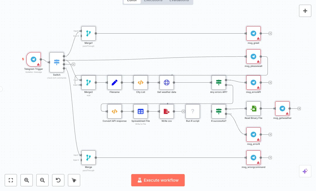 The bot listens for messages, routes commands, and replies with either a greeting, a help note, or the weather image. When weather is requested, it sends a please wait message, builds a city list, pulls live data from OpenWeather for each city, reshapes the data, and writes a CSV. An R script then turns that CSV into a PNG chart. Error checks isolate API failures and rendering issues, so users see clear messages when something goes wrong. Files are named with user id and timestamp to avoid overwrites and to keep results traceable. The final image is read from disk and posted back to the chat with a short caption.