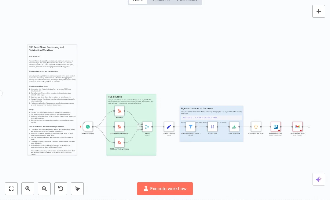 A weekly schedule runs on a set day and hour. Three RSS sources are read, then all items are combined, mapped, filtered to the last seven days, sorted by newest, and trimmed to a set count. The list becomes a simple Markdown summary with titles and links. That summary is posted as a Trello card comment, and Gmail sends a quick note so someone can review the post.