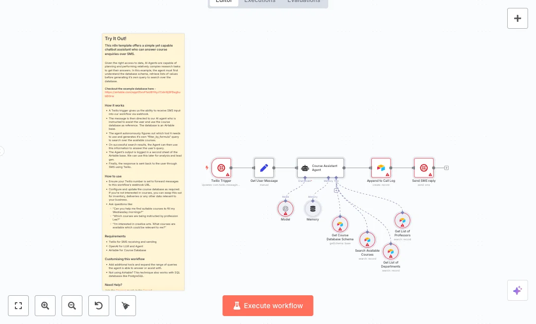 Incoming messages arrive through a Twilio trigger. A set step collects the text and passes it to an agent powered by OpenAI with short term memory. The agent chooses tools to read your Airtable schema, list professors and departments, and build its own filter by formula to search classes. It learns the structure first, then runs precise searches so answers match the source of truth. The reply and the original question are saved in a Call Log table, then a Twilio node sends the answer back to the sender.