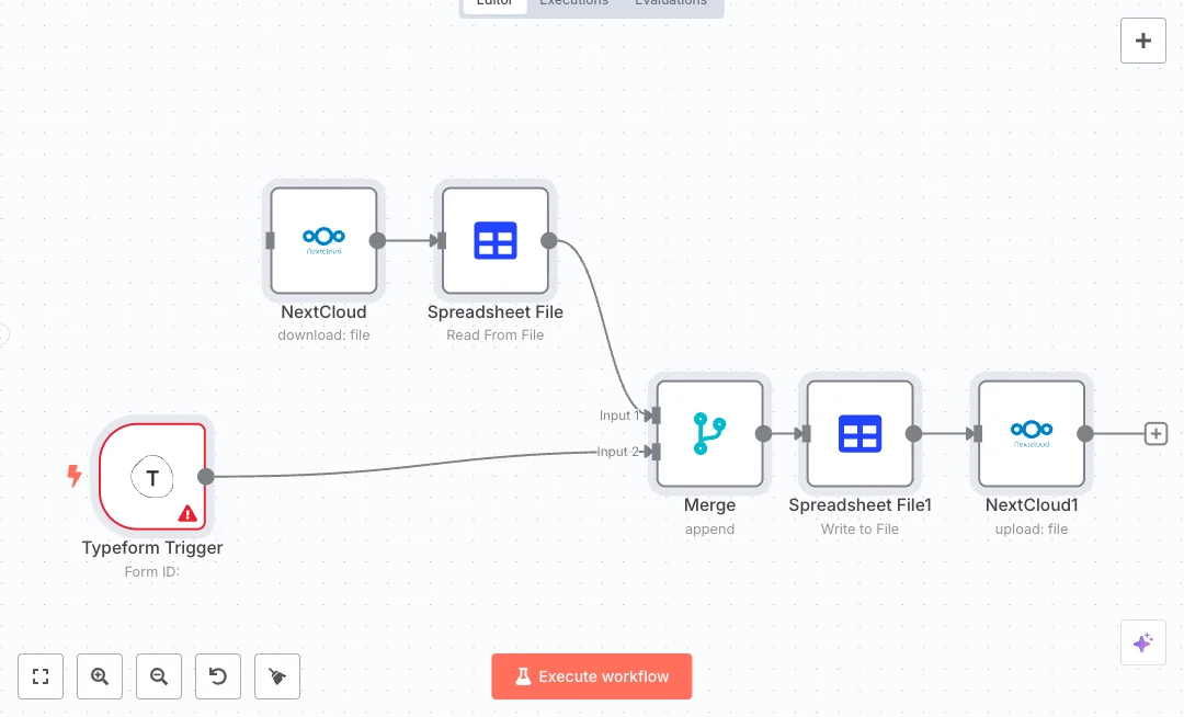 When a new form entry arrives, the Typeform trigger starts the flow. The workflow downloads the current spreadsheet from Nextcloud, reads the rows, and pairs them with the new answers. A merge step adds the new data to the existing list, then a spreadsheet node writes a fresh file. Finally, the file uploads back to the same Nextcloud path so your team always opens the latest version.
