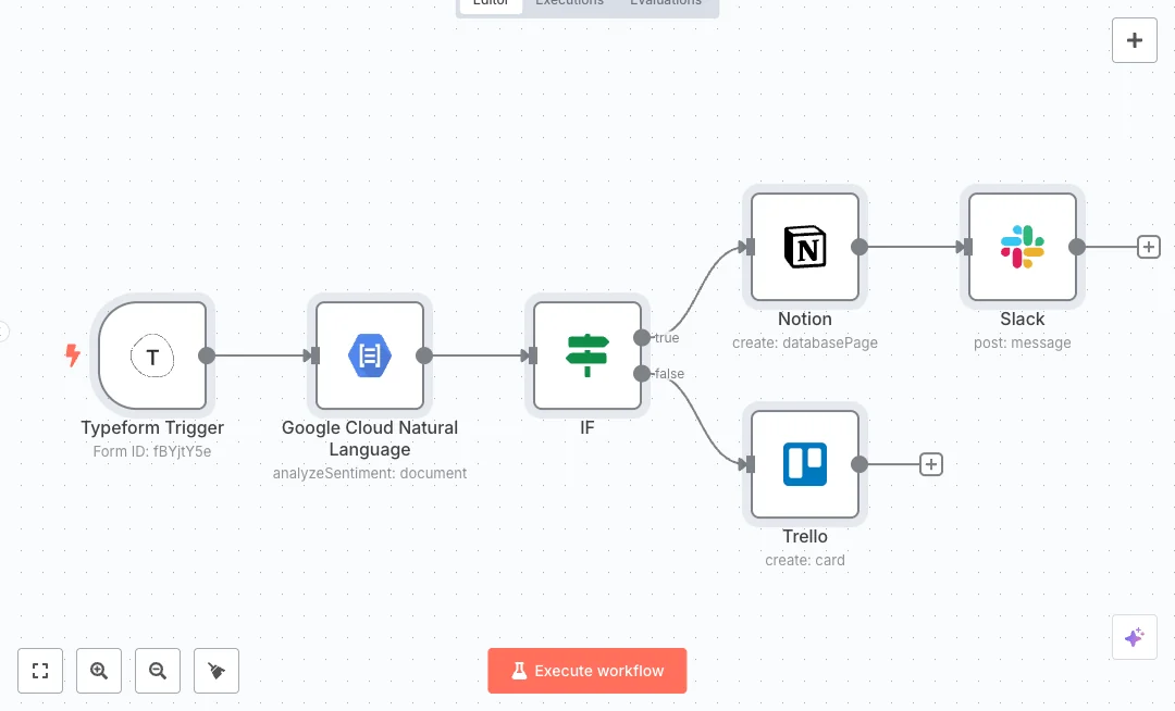 Here is how it runs end to end. A Typeform trigger catches each new response. Google Cloud Natural Language reads the suggestion text and returns a sentiment score. An IF check compares the score to a threshold. Positive items create a page in a Notion database and then post an alert in a Slack channel. Lower scores open a Trello card for follow up. Teams get a shared view of praise and issues without manual sorting.