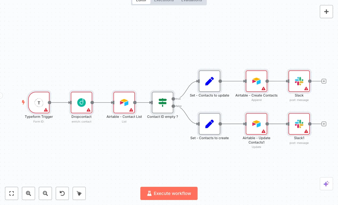 You need accounts for Typeform, Airtable, Slack, and Dropcontact. Make sure your Airtable table includes the fields used here or adjust the mappings to match your schema. Run a test submission to confirm the create and update paths. Teams often cut manual entry time and reduce duplicates. Use it for ads, event signups, and website contact forms.