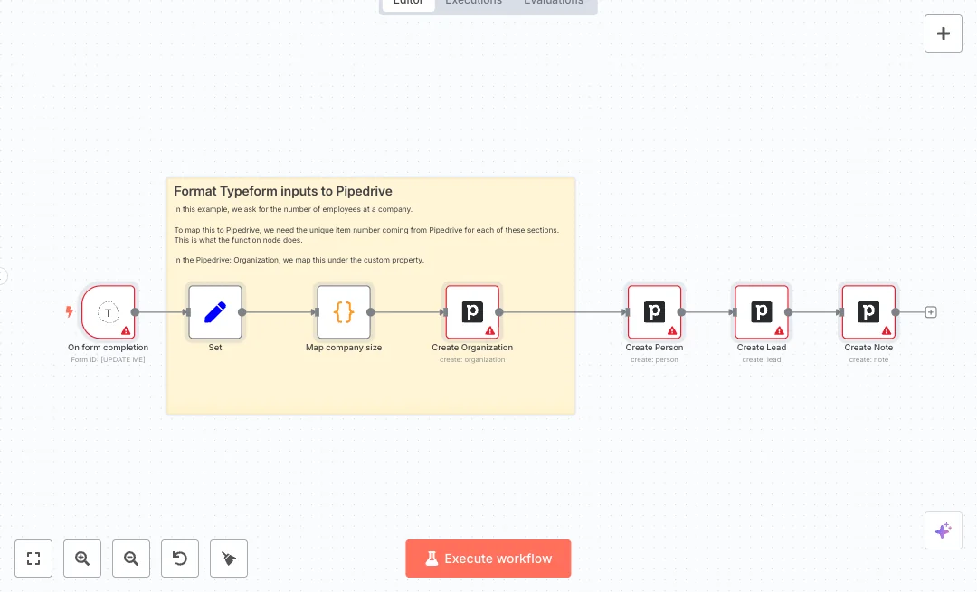 An event from Typeform starts the run. A Set node standardizes answers and keeps only the fields you need. A Code node converts the selected company size into the exact Pipedrive option ID for a custom field, so data lands in the right place. The flow then creates an Organization, links a Person to that org, opens a Lead, and attaches a Note with key answers and the company size. Reps get context and structure right away, which speeds up follow up and reduces mistakes.