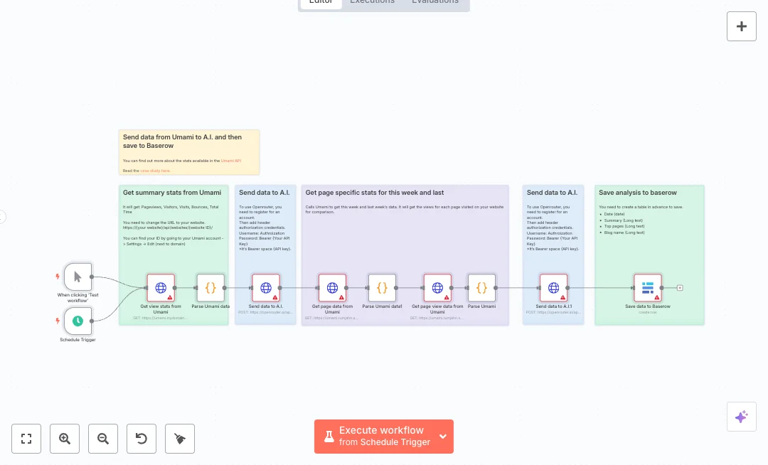 Get weekly SEO insights without manual work. The workflow collects website analytics from Umami, asks an AI to explain what happened, and saves the results in Baserow for easy tracking. It is ideal for content and marketing teams that want fast, clear reports.