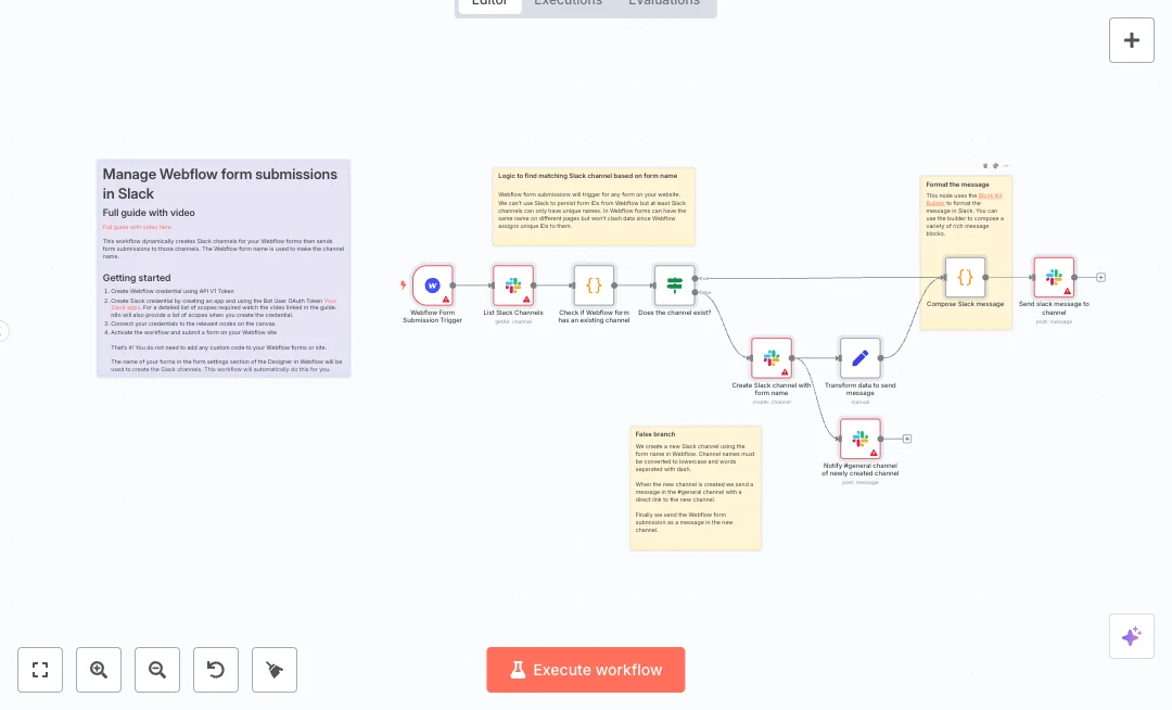 A form submission in Webflow starts the flow. The system lists Slack channels, converts the form name to a valid channel name, and checks if it already exists. If it does, a message is built with Block Kit that shows all fields in a clean layout and is sent to that channel. If it does not, a new channel is created, the general room is notified with a link, and the submission is posted in the new space. Data is shaped with a Set node and custom code formats the content for clarity.