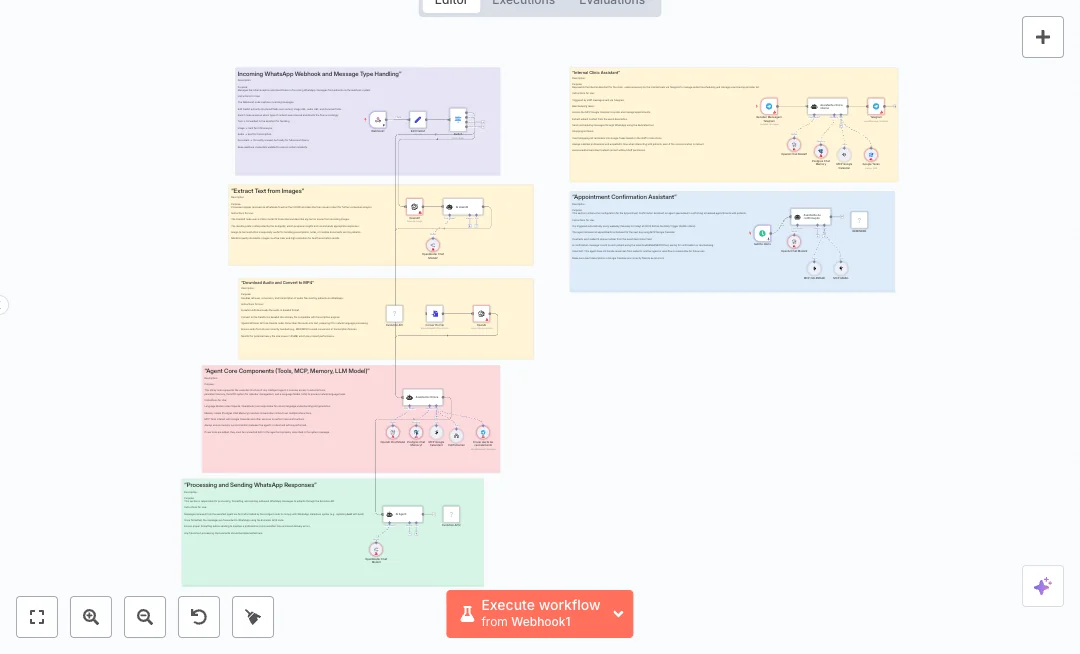 Every weekday at 08:00, the scheduler collects next day events from Google Calendar, reads the phone number from the event description, formats a confirmation message for WhatsApp, and sends it through the Evolution API. Incoming WhatsApp messages land in a webhook and are sorted by type. Text goes to the assistant, audio is downloaded, converted, and transcribed by OpenAI, and images are read with a vision model. Postgres memory keeps context. Urgent or sensitive topics can be escalated to a human. A Telegram assistant lets staff reschedule via the calendar and add items to Google Tasks.