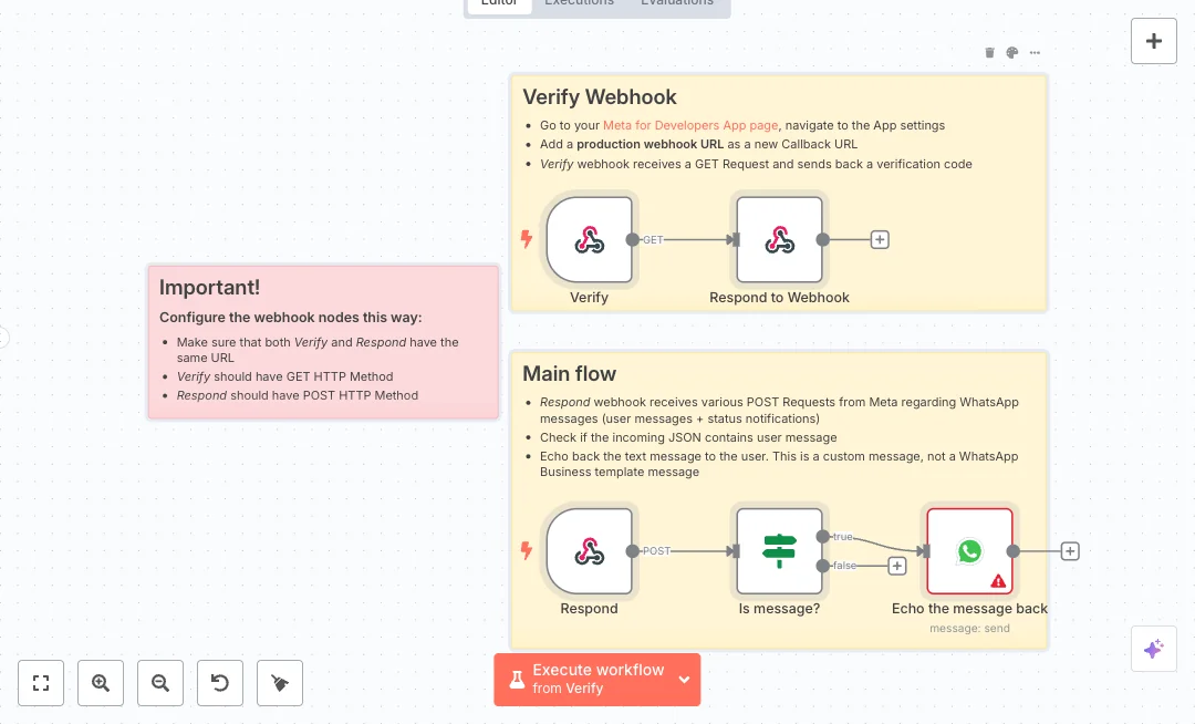 Give customers a fast reply on WhatsApp while also confirming your webhook setup. The flow returns the Meta verification code and sends an instant echo message back to the sender. It fits support teams and small businesses that want quick first responses and a simple test harness.