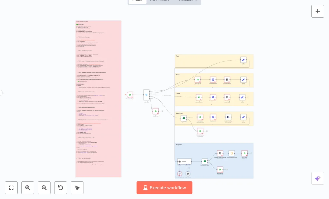 Incoming messages are received by the WhatsApp trigger and routed by type. Images are fetched and analyzed with an AI vision model to produce a clear description. Voice notes are downloaded and transcribed to text. PDFs are checked for the right format, downloaded, and their text is extracted. All content is then normalized and sent to an AI agent with short term memory so replies stay on topic across messages. The system can answer with text or return an AI generated audio reply. If a file type is not allowed, a helpful notice is sent back.