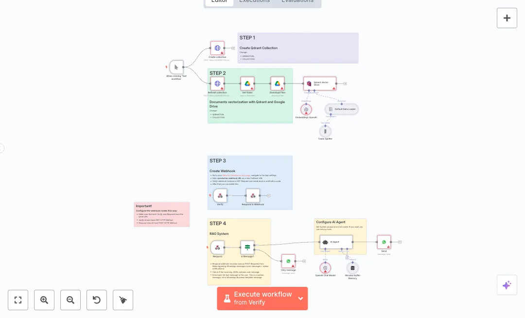 Here is how it works. Files in a Google Drive folder are split into small chunks, turned into embeddings with OpenAI, and stored in a Qdrant collection. A manual run builds and refreshes this collection. Meta sends WhatsApp messages to a single webhook URL. A filter checks that the event is a real user message. The AI Agent uses an OpenAI chat model and chat memory to compose a clear reply. The message is then sent back over WhatsApp. A verify endpoint echoes back the hub challenge so the webhook can be approved by Meta.