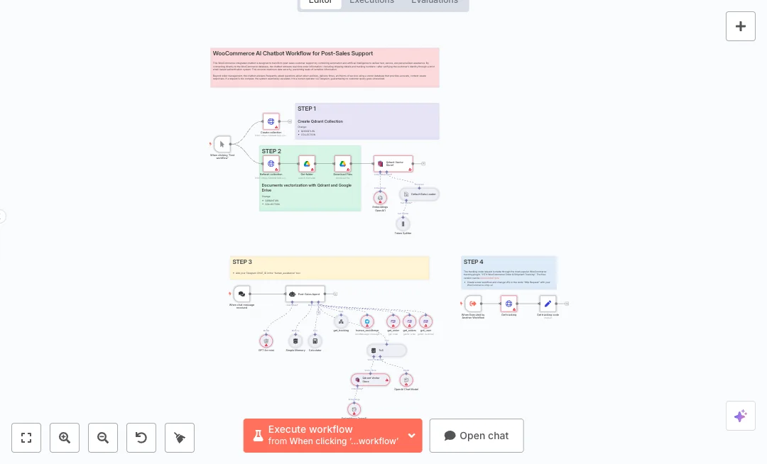 Setup is straight forward. Point the Qdrant nodes to your server, pick a collection name, connect Google Drive, and add your WooCommerce and WordPress credentials. Add your Telegram chat ID for human handoff. Stores see fewer tickets, quicker resolutions, and fewer repeat questions. This is ideal for shops with steady order volume that want reliable post sales replies without growing the support team.