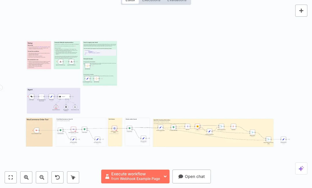 Setup needs WooCommerce, DHL, and OpenAI credentials, plus one shared secret for email encryption and decryption. Keep the crypto setting enabled, update the agent system message with your store name, and embed the example chat page with the provided webhook URL. Expect fewer tickets, faster updates, and a smooth customer experience for post purchase support. Stores that use DHL get live tracking in the same chat. If you use another carrier, you can swap the tracking step.