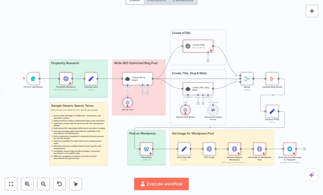 Here is how it works. The form trigger starts a Perplexity research call that gathers sources and links. A cleanup step trims messy URLs. An AI copywriter builds the article, and a second AI step creates a clear title, a short slug, and a strong meta description using a structured parser. The HTML creator outputs WordPress ready HTML only. All details are merged and cleaned, then saved as a WordPress draft. An image is fetched from a URL, uploaded to the media library, set as the featured image, and a Telegram message confirms success.