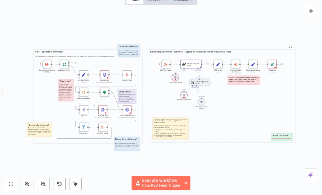 Here is how it works. A schedule checks the RSS feed every minute. An AI model generates a structured list of tags, and an auto fixing parser keeps the format clean. The flow pulls all current WordPress tags through the API, normalizes case and slugs in a code step, and finds what is missing. It creates only the tags you need, fetches the updated list, filters the matches, and aggregates tag IDs. A WordPress node then posts with the correct tags. It loops through many articles in batches and can also be called as a subworkflow.