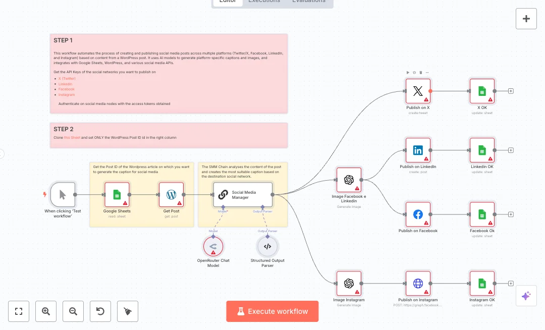The run starts on a manual test. It reads a Google Sheets row to grab a WordPress Post ID, then fetches the post content. An OpenRouter model builds four captions using a structured format so each network gets the right text. OpenAI creates images in two sizes, one for Instagram and one wide format for Facebook and LinkedIn. The workflow then posts to each platform through their APIs and writes an x back to the Google Sheet to confirm success per channel.