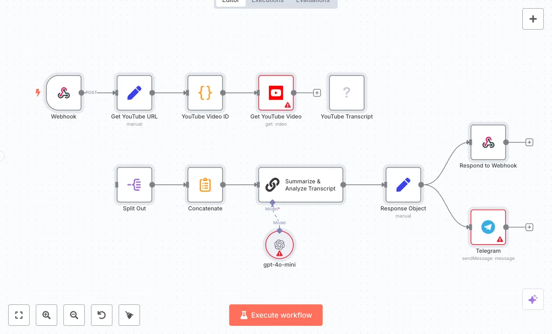 You will need a YouTube API key, an OpenAI API key, and a Telegram bot token. Expect to cut review time from 30 minutes to 2 minutes per video and keep your team aligned in chat. Useful for competitor tracking, briefing writers, planning social posts, and quick research when your team needs the key points without watching the full video.