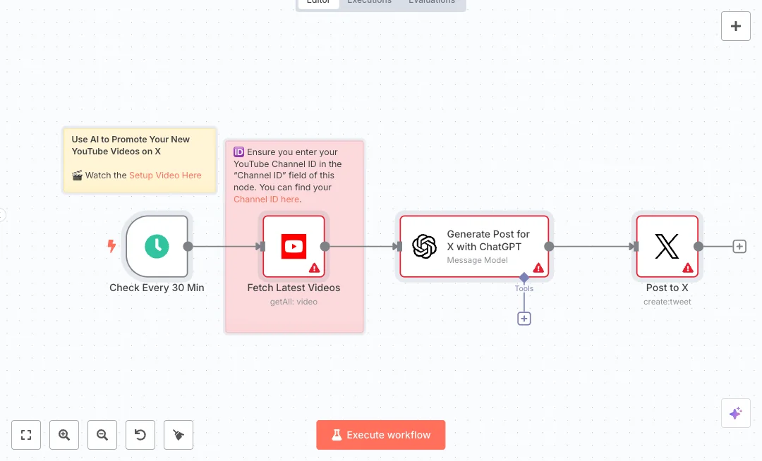 Every 30 minutes a schedule runs. It asks YouTube for the newest video from your channel that was published in the last 30 minutes. The video id feeds into an OpenAI prompt that writes a 140 character post and includes a youtu.be link. The final text goes to Twitter and publishes through your connected account.