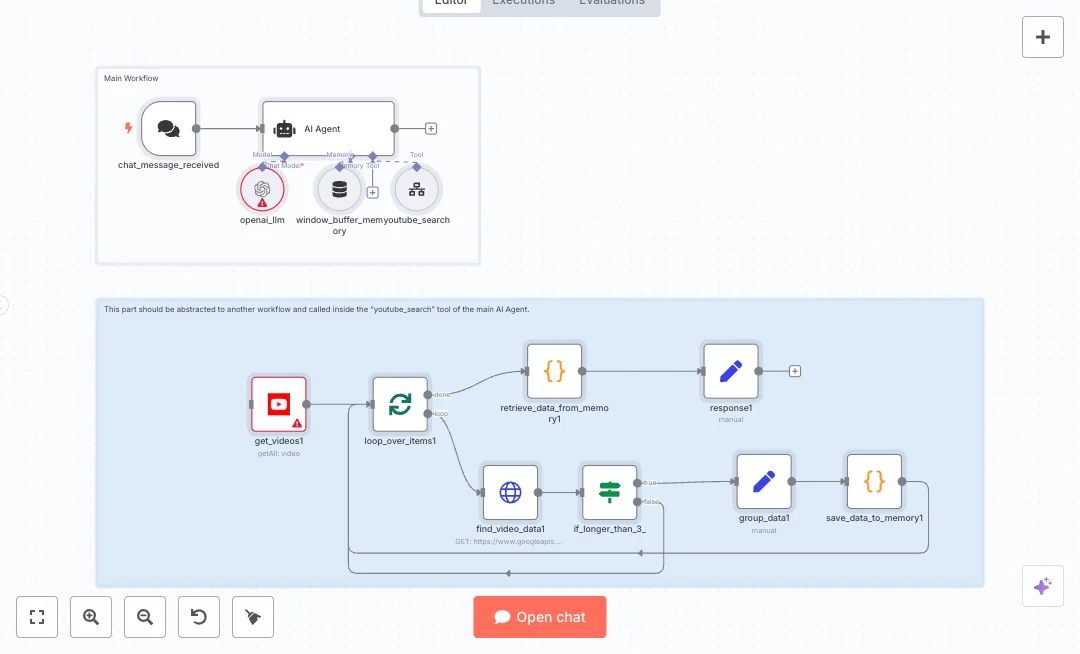 A chat message triggers an AI agent that checks if you set a niche. The agent calls a YouTube search tool that scans the last two days in the US with safe search and picks the top three results. The flow loops through each video, pulls full details from the official API, and keeps only videos longer than three minutes. It stores the best picks in memory and returns a clean summary back to the chat. The system uses OpenAI for language, YouTube for search, a loop for batching, and code nodes to keep the final list in workflow memory.