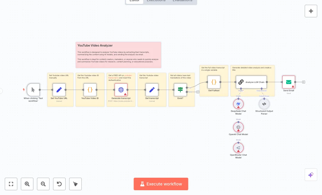 You click run to start. A Set node holds the YouTube URL. A Code node extracts the video ID. An HTTP Request posts that ID to youtube-transcript.io to get the transcript. A check confirms a transcript exists. Another Code node combines all transcript parts into one block of text. An AI chain reads the text with the DeepSeek model and creates a structured title and summary using a strict output parser. The email node sends the result to your inbox. OpenAI and OpenRouter model nodes are included if you want to switch models later.