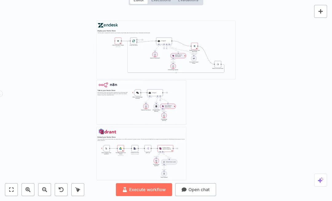 A manual run loads a JSON file from Google Drive. The data is split, labeled with useful fields, and embedded with OpenAI into a Qdrant vector store. A chat trigger lets you ask questions about the knowledge using GPT 4o with short memory. Another path pulls Zendesk tickets, loops over each one, and sends the subject and description to an AI agent. The agent searches the vector store and returns structured JSON with MITRE tags and remediation. The ticket is then updated in Zendesk with this context.