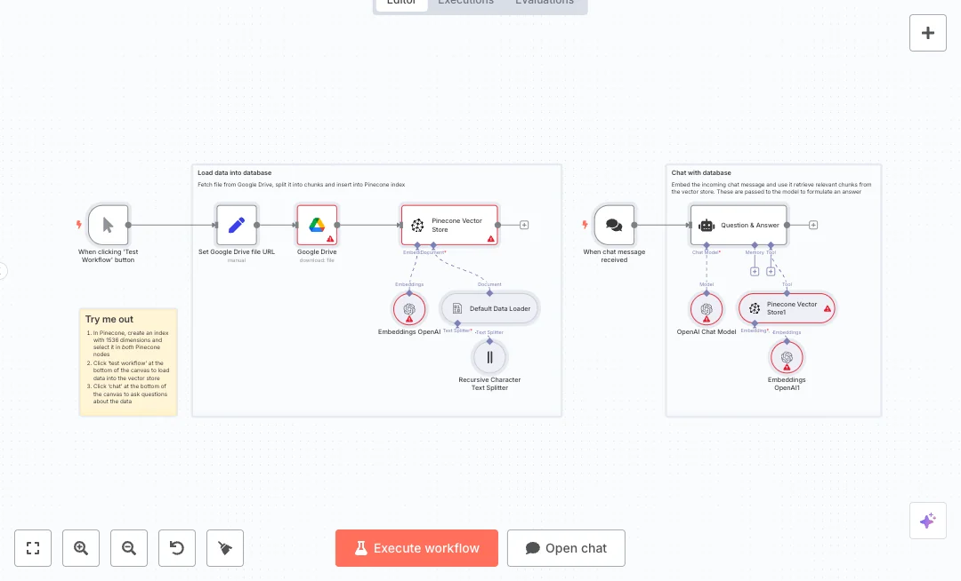 When you click Test Workflow, the flow sets a file URL, downloads the file from Google Drive, splits the text into chunks, builds embeddings with OpenAI, and writes vectors into a Pinecone index. For chat, a message triggers an agent that embeds the question, pulls the best matching chunks from Pinecone, and uses an AI chat model to write a clear answer. The model is guided by the retrieved text, which helps keep answers on topic and reduces guesswork. People get what they need fast without reading long PDFs.