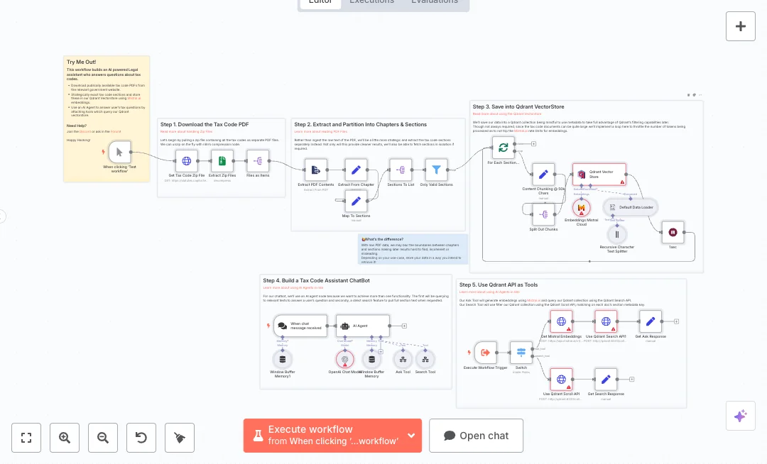 You need a Qdrant endpoint, a Mistral AI key, and an OpenAI key. Set your collection name and base URL, then run the index one time to load the data. After that, send chat questions to the webhook to get relevant snippets or full section text on request. Teams cut research time, improve answer consistency, and can reuse the same design for any policy or rulebook library.