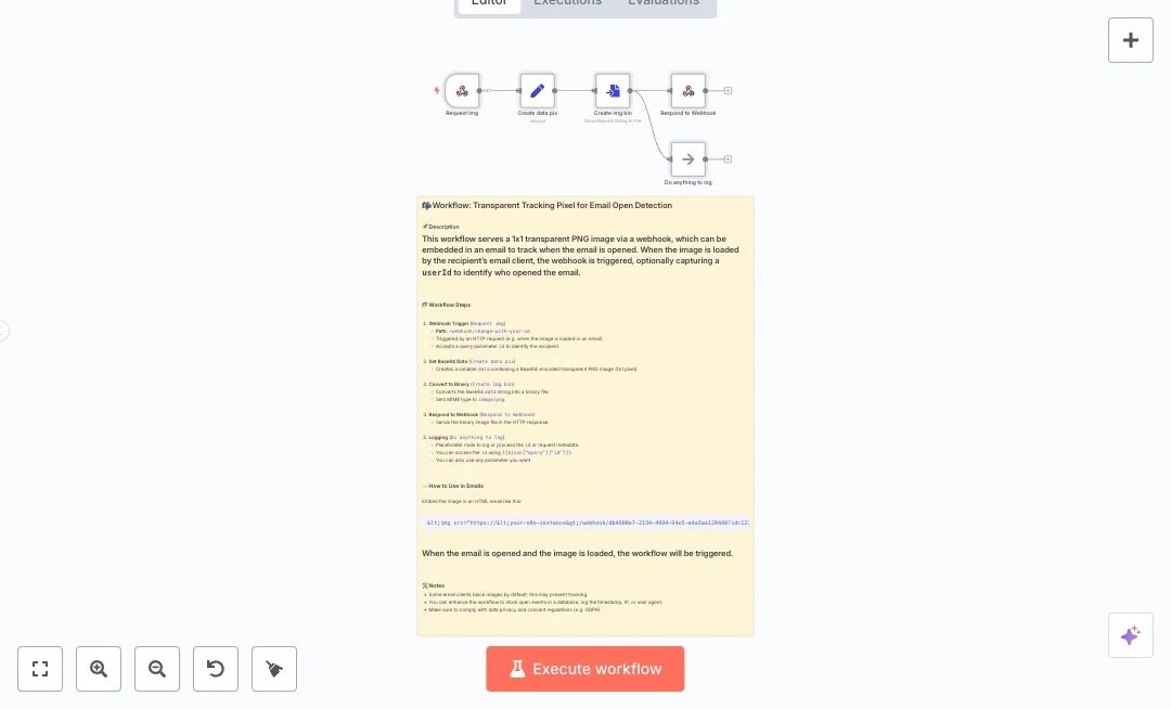 A public webhook receives the request each time the image loads in the mailbox. A Set node holds a base64 version of a 1x1 transparent PNG, then Convert to File turns it into a real image with the image/png type. Respond to Webhook streams the binary file back so the email client displays it, while an optional step can log the id and request details for reporting. The flow is light, has no external credentials, and returns the image in milliseconds.
