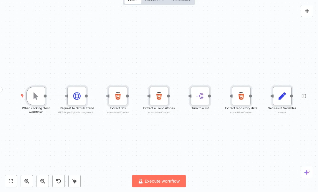 The flow begins with a manual trigger, then an HTTP request loads the GitHub trending page. An HTML step isolates the main content box, another HTML step collects every repository row, and a split step turns that group into individual items. For each item, the parser reads the repo link text, the language label, and the description and cleans the result. A final set step pulls the author from the repo path and outputs a tidy JSON record for easy reuse.