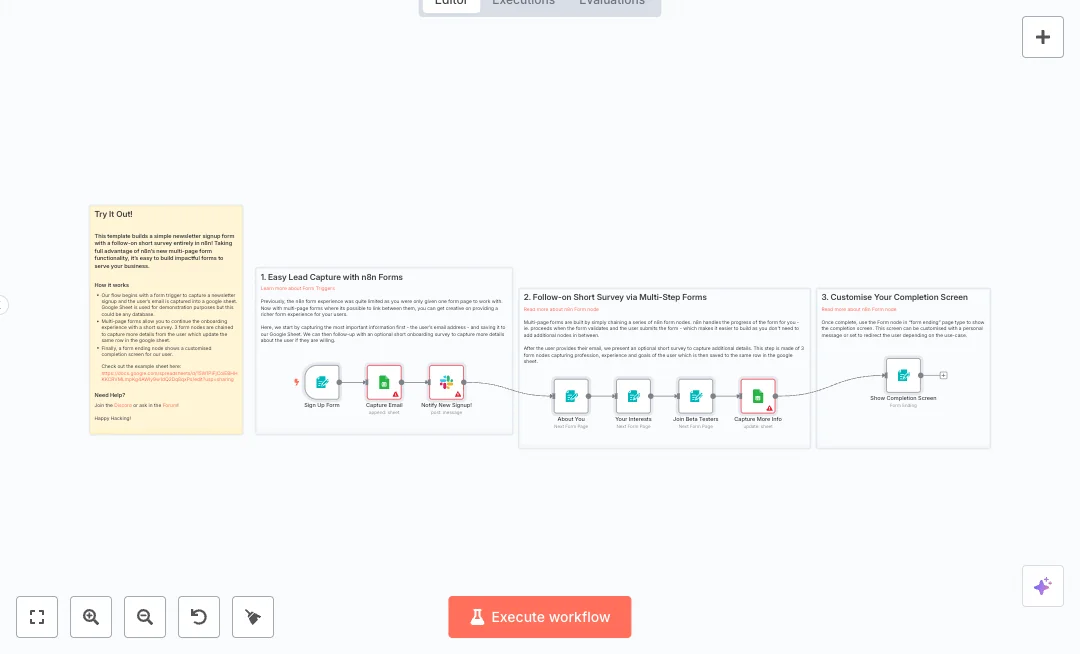 The flow starts with a form trigger that asks for the email and appends a new row to Google Sheets with the date and a unique execution id. A Slack message notifies your chosen channel immediately. Next, three form pages ask for name, country, role, experience, goals, and beta interest. The same Google Sheets row is then updated using the unique id so all answers stay together. A custom completion screen thanks the user when finished.