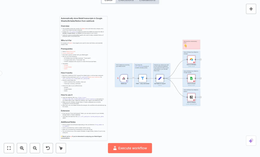 To set this up, connect the webhook from your voice platform to the n8n URL and link your Google, Airtable, and Notion accounts. Match your table, sheet, and database columns to the mapped fields. Expect faster QA and reporting, consistent records across apps, and less manual work. Common uses include sales call reviews, support quality checks, and operations audit trails.