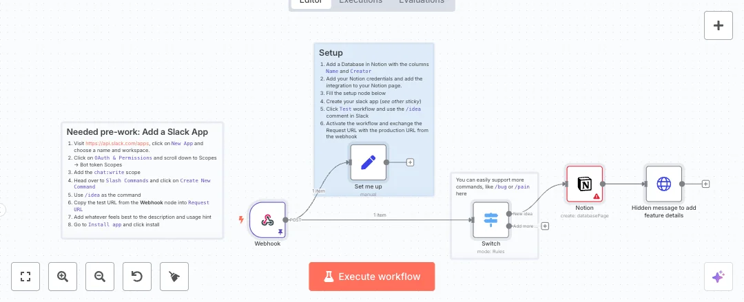 Set up a Notion database with Name and Creator, and create a Slack app with chat write and a slash command. Connect your Notion account in n8n, drop in the database URL, and try a test run from Slack. Expect faster intake, fewer missed ideas, and a clear record in one place. Useful for product ideas, customer pain notes, and quick bug reports.