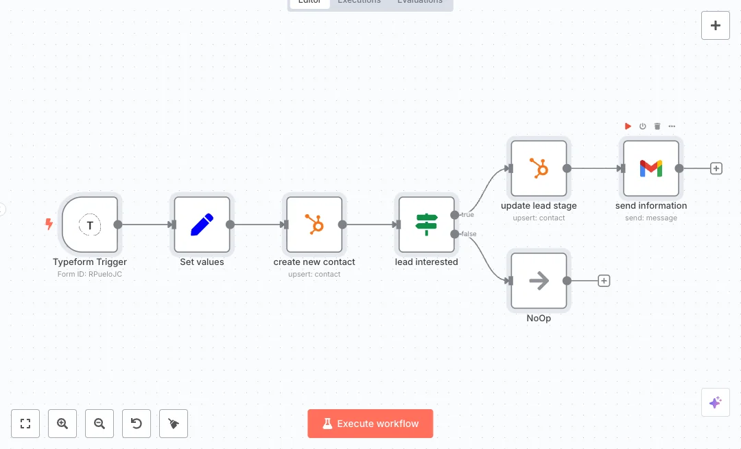 Here is how it runs. A Typeform event starts the flow. A Set node cleans the data and maps each answer to clear fields like first name, last name, email, company, department, and interest. Then a HubSpot node creates the contact using those fields. An If check looks at the interest answer. If true, the contact moves to the opportunity stage in HubSpot and Gmail sends a personal message with a booking link. If not, the path stops with a NoOp. The email uses the first name and the address pulled from the new contact.