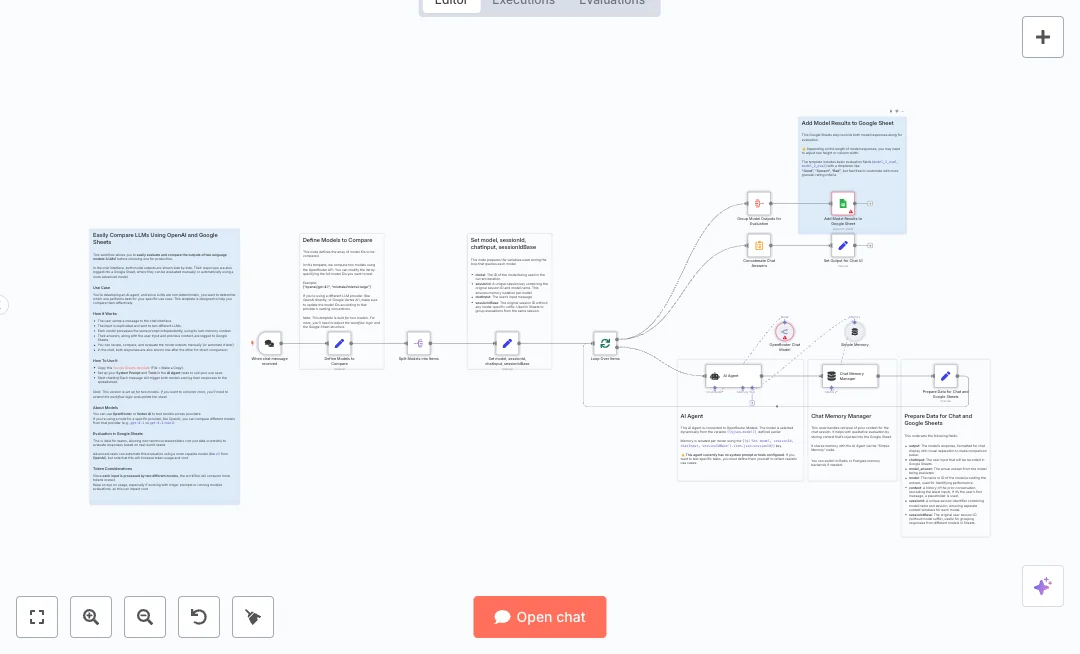 A chat trigger starts the run when a message arrives. The message is split so each model in your list receives the same input. Memory is isolated per model, so history does not mix and your comparison stays fair. An AI Agent calls the selected OpenRouter model, then the results are prepared, grouped, and pushed to your sheet. The interface shows both answers together by combining the outputs, so you can compare quickly in one place.