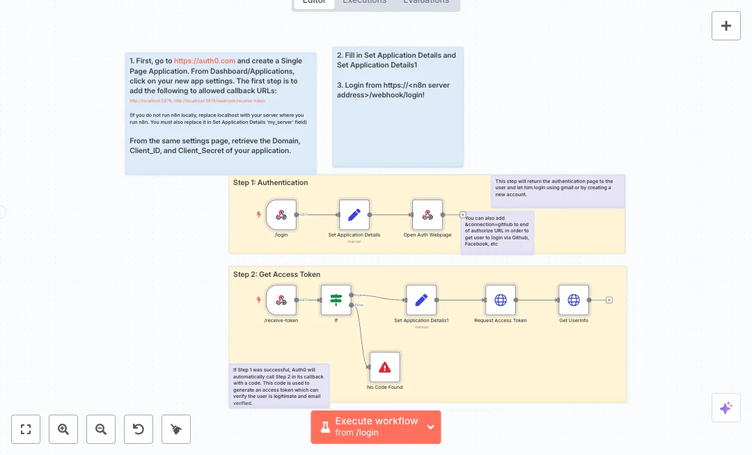 Setup is simple. Create a Single Page Application in your identity provider, add the callback URLs, and paste the domain, client id, and client secret into the Set nodes. Expect faster onboarding and fewer access mistakes because sign in is handled in one place. Use this to guard admin panels, internal request forms, or any workflow that must run only for known users.