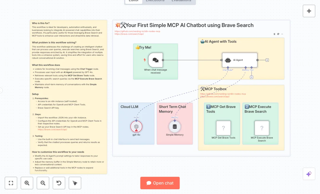Setup is simple. You need an n8n instance, an OpenAI API key, and a Brave Search API key. Connect both keys in n8n, confirm the MCP tool list loads, and test a few questions in the chat interface. Expect quicker replies, lower handle time, and fewer escalations. Great for help widgets, status checks, and content questions that change often.