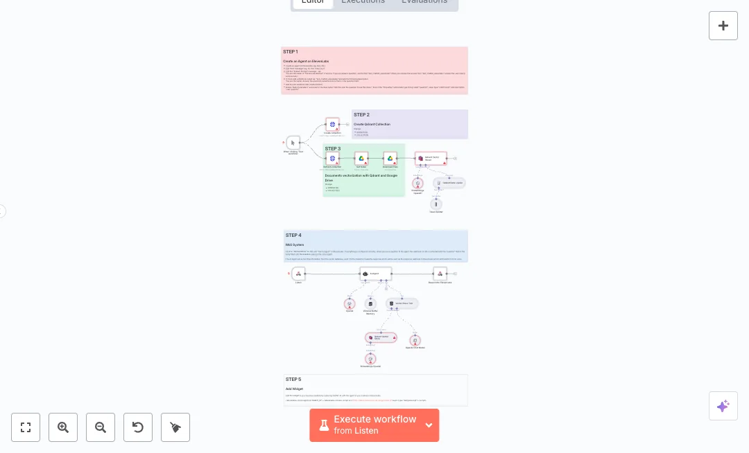 Here is how it works. A webhook listens for a question from the voice agent. Your Google Drive files are loaded, split into small parts, turned into embeddings with OpenAI, and saved in a Qdrant vector database. An AI agent uses an OpenAI chat model and a vector store tool to search Qdrant and craft a helpful response. The workflow then returns the answer to the voice agent, which speaks it back to the visitor.
