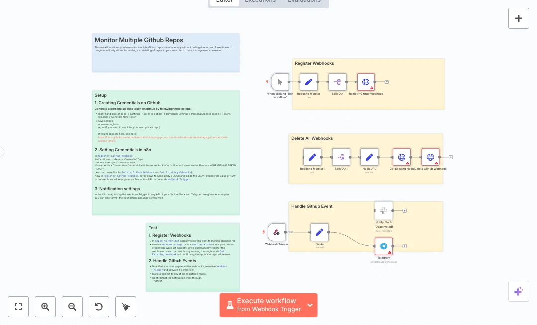 Under the hood, a manual test step registers webhooks on each repo you list. Split nodes loop through the repo list, while HTTP requests create or delete webhooks on GitHub. A webhook trigger then receives push and pull request events in real time. Messages are shaped with Set nodes and sent to Slack and Telegram for quick action.