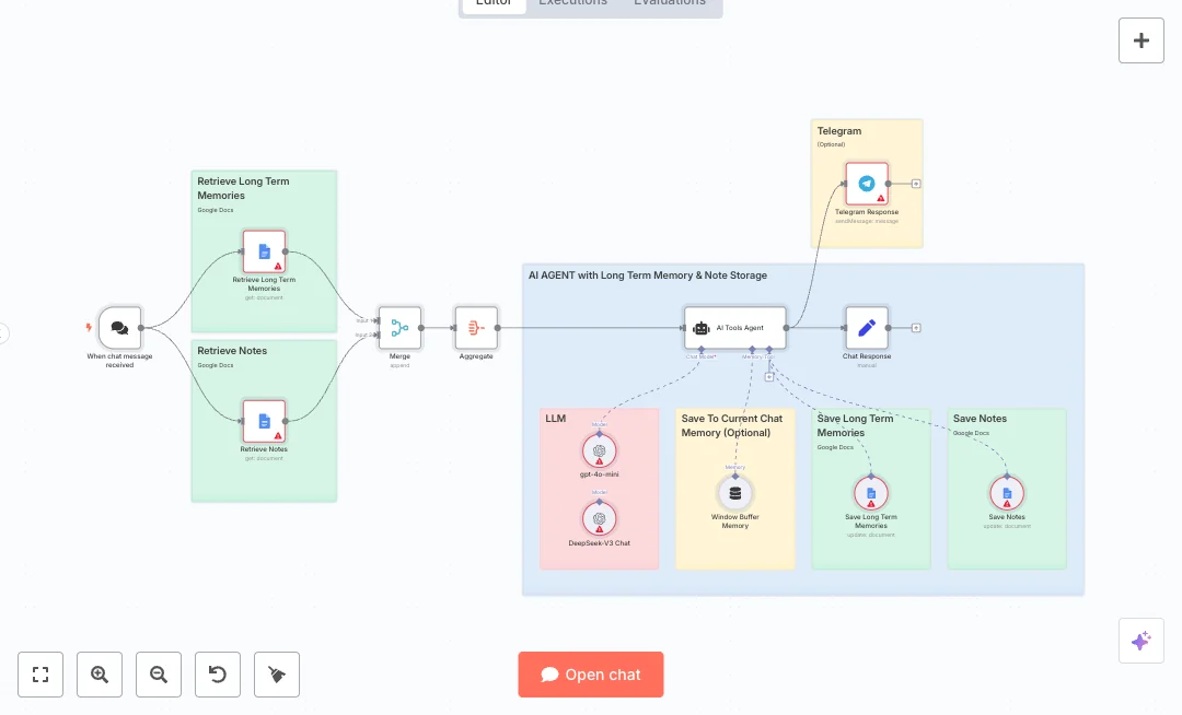 When a message comes in, the system loads long term memories and notes from two Google Docs files, merges them, and feeds that context to an AI agent. The agent uses gpt 4o mini, keeps a rolling window of 50 messages, and can call tools that save new memories with a date stamp. Replies go back to the chat and can also be posted to a Telegram chat. Merge and Aggregate nodes combine sources so the agent sees a single context snapshot.