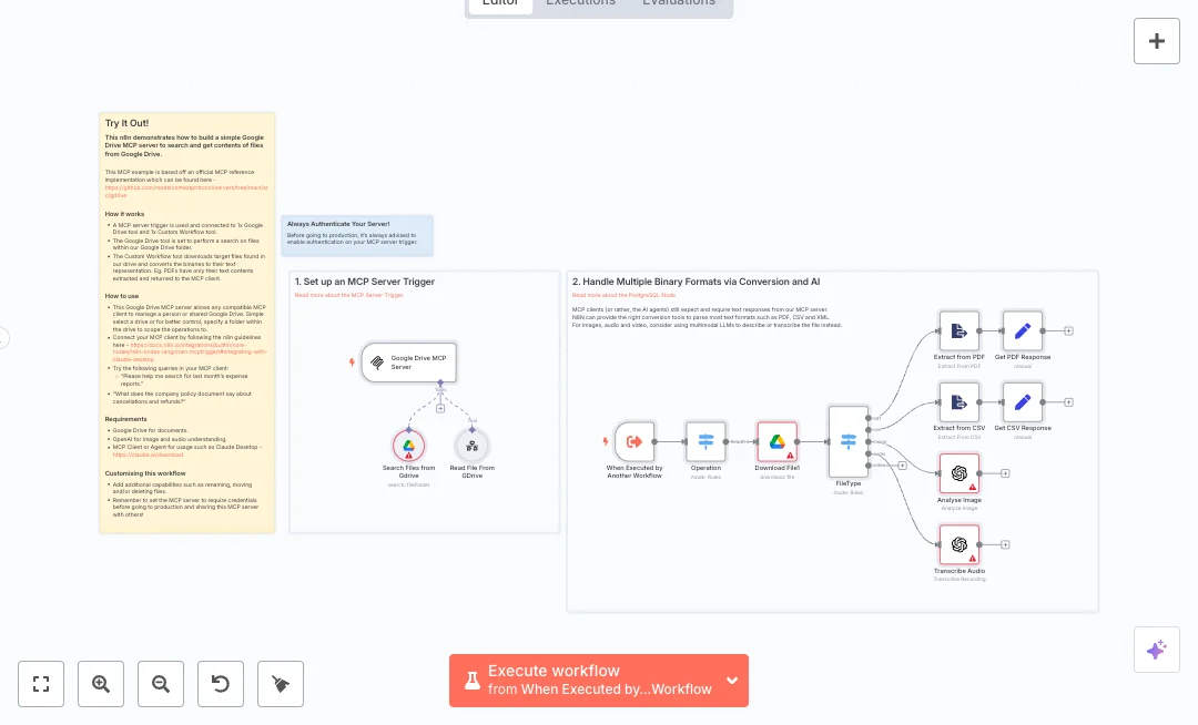 An endpoint exposes two actions. Search finds up to ten files in your drive using a query. Read downloads a chosen file and converts it to text based on type. PDF and CSV files are parsed to plain text. Google Docs become text and Slides are converted to PDF first. Images are described using an AI vision model. Audio is transcribed to text. Switch nodes route each file type, and set nodes return one clear response field for easy use. This removes manual downloading and format changes.