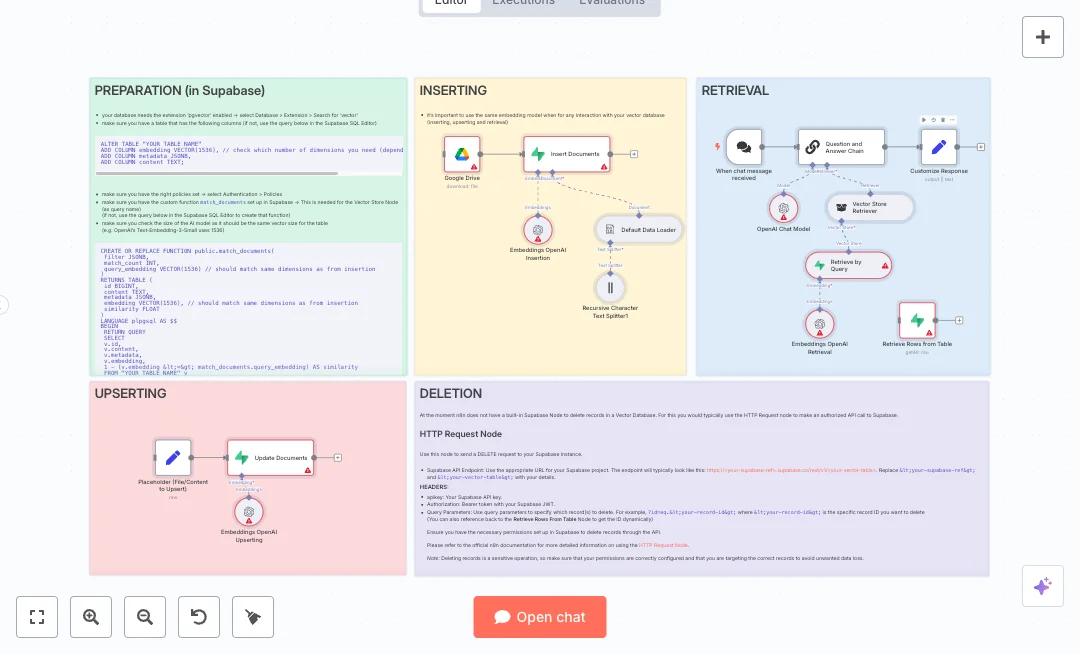 Create a chat assistant that answers questions from your documents. It loads a file from Google Drive, stores it in a Supabase vector database, and uses an AI model to give clear answers. Great for support teams, training content, or policy help.