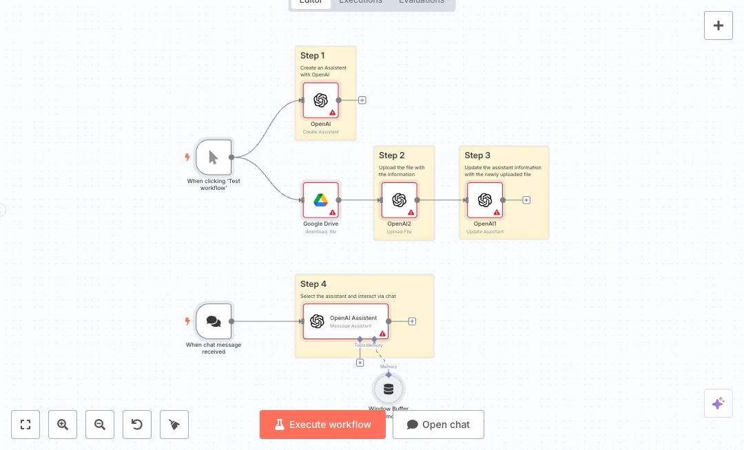 The setup pulls a file from Google Drive, converts it to a PDF, uploads it to OpenAI, and links the file to a new or existing assistant. A chat trigger listens for messages, and a memory node keeps a short history so replies feel natural. Strict instructions tell the assistant to use only the attached file, which helps control quality and reduce off topic answers. Manual trigger steps handle creation and updates, while chat runs on a webhook for live use.