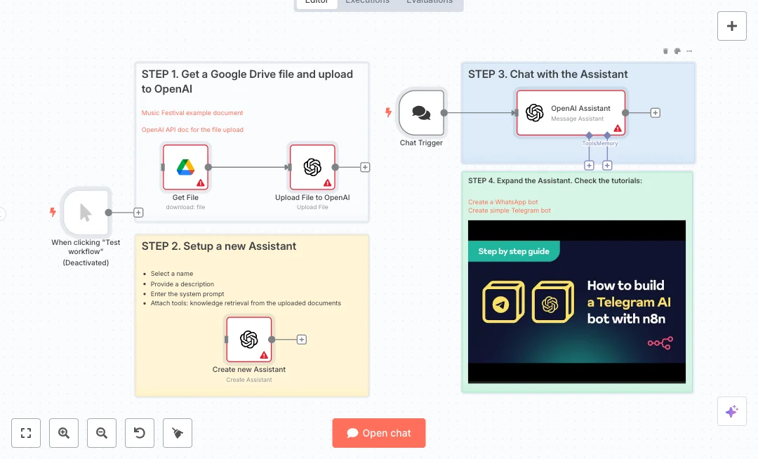Here is how it works. A manual run fetches a selected Google Drive file and converts it to PDF. The file is uploaded to OpenAI and used to build a dedicated assistant with a clear system prompt and knowledge retrieval turned on. A chat trigger exposes a simple chat endpoint. Incoming questions flow to the OpenAI Assistant node, which replies using only the uploaded content, so answers stay accurate and on brand.