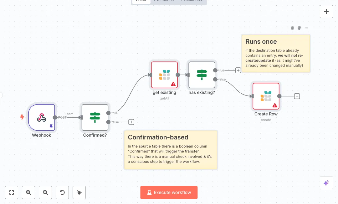 Here is how it runs. A POST request hits the Webhook node and provides an id and a Confirmed flag. The Confirmed check allows only true values to continue. The flow then queries Grist for a row where the Source field matches the incoming id. If a match is found, the run stops to protect edits already made in Grist. If there is no match, a new row is created with the Source id. Sticky notes in the canvas describe the human review step and the single create policy.