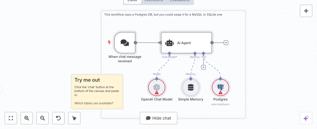 When a message arrives, a chat event passes it to an AI Agent powered by the OpenAI Chat Model. A short memory window keeps recent context so follow up questions work. The agent turns each request into SQL and sends it to the Postgres tool to run using the sql_statement field, so there are no hardcoded queries. Results come back to the same chat, so people can keep digging. A starter question like Which tables are available helps the agent explore the schema, then you can ask for counts, trends, and filters.
