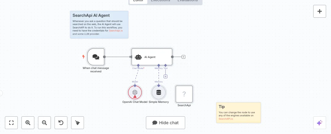 When a message arrives, the chat trigger sends it to an AI agent. The agent uses an OpenAI chat model with a short memory of the last 20 messages to keep context across follow ups. If live data is required, the agent calls SearchAPI with the query and reads the results. The answer is then written in the same chat, so your team gets one clean response that blends reasoning and current data.