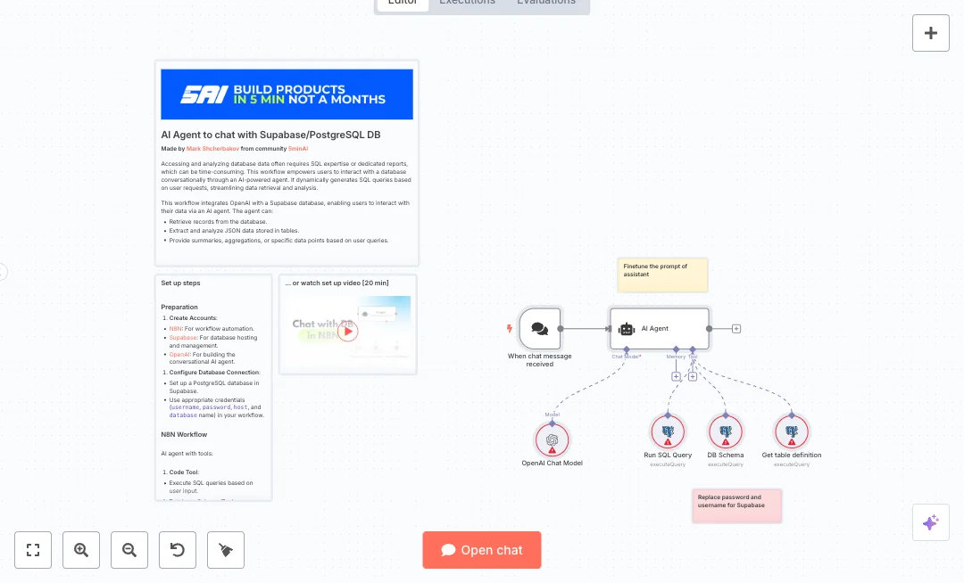 Set your OpenAI and database credentials, then adjust the system prompt to match your rules and tone. Expect faster answers to common data questions and fewer analyst tickets. Typical uses include daily KPIs, quick record lookups, ad hoc checks on JSON or text fields, and simple trend reviews for non technical staff.
