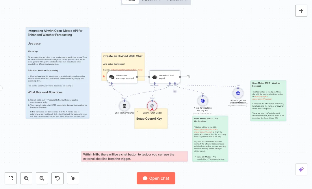 Messages enter through a web chat trigger. A short term memory node keeps context so follow up questions make sense. The agent uses OpenAI to decide which tool to call and in what order. It first turns a city name into latitude and longitude using the Open Meteo geocoding API. Then it pulls daily max temperature and rain totals from the Open Meteo forecast API with the requested number of days. The reply goes back to the same chat in one flow.