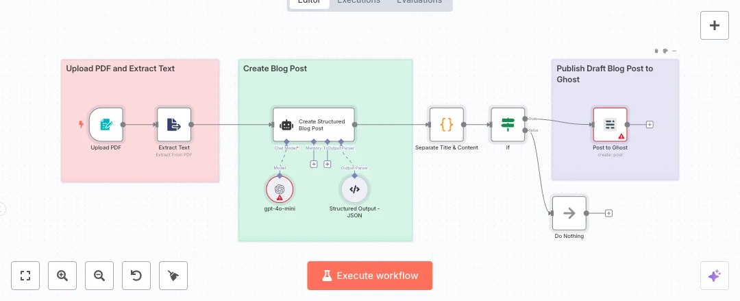 A simple web form collects a PDF. The file goes to a text extractor that pulls the words from the PDF. An AI writer then turns that text into a blog post with a clear title and body, and it formats the output as JSON. A parser checks that only title and content are present. A small code step separates and validates both fields. A check step makes sure nothing is empty. If both pass, a draft post is created in Ghost using the Admin API. If the checks fail, the flow stops safely.