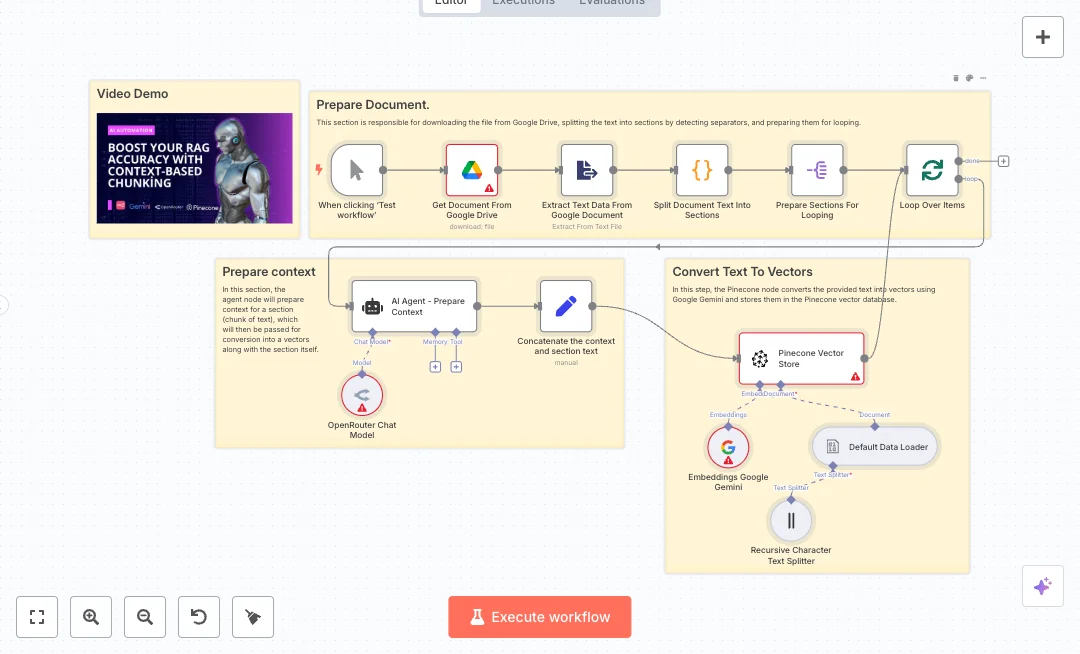 The flow starts on a manual run. It downloads a Google Doc as plain text, extracts the content, and uses custom code to split the text by a clear separator. Each section moves through a loop. An AI agent, powered by an OpenRouter chat model, reads the full document and the current section to write helpful context. The context and section are joined into one text. Google Gemini creates embeddings, and the Pinecone node inserts them into a chosen index. This design improves relevance because each chunk carries situational context, not just raw text.